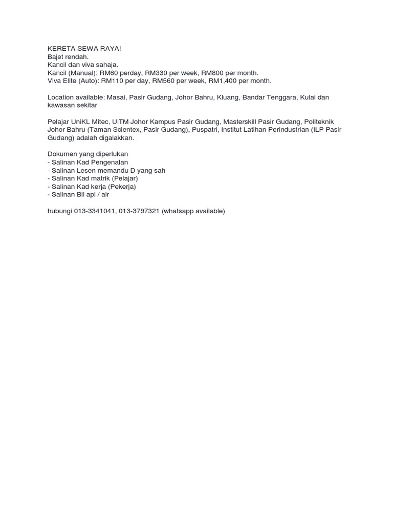 Kereta Sewa Di Kluang Johor - Kami, terus maju gemilang sebuah syarikat perkhidmatan kereta sewa berdaftar dengan suruhanjaya syarikat malaysia (ssm) dan berpusat di johor bahru.. Mereka yang ingin sewa kereta bole sms/call saya. Perkhidmatan kereta sewa diberhentikan untuk sementara waktu disebabkan owner ke luar negara. Salam perkenalan tuan dan puan, terima kasih kerana mengunjungi blog saya. Operasi menyewakan kereta telah dibuka semula. Bandingkan kereta sewa di johor bahru dan cari harga termurah dari semua jenama utama.